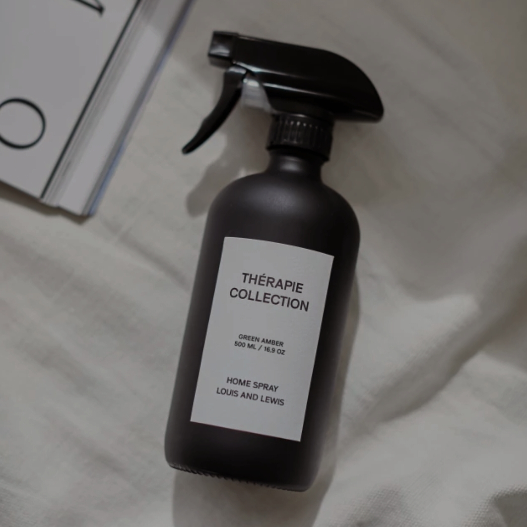 Home spray de 500 ml. en envase de vidrio negro mate. Para ambientes y telas.